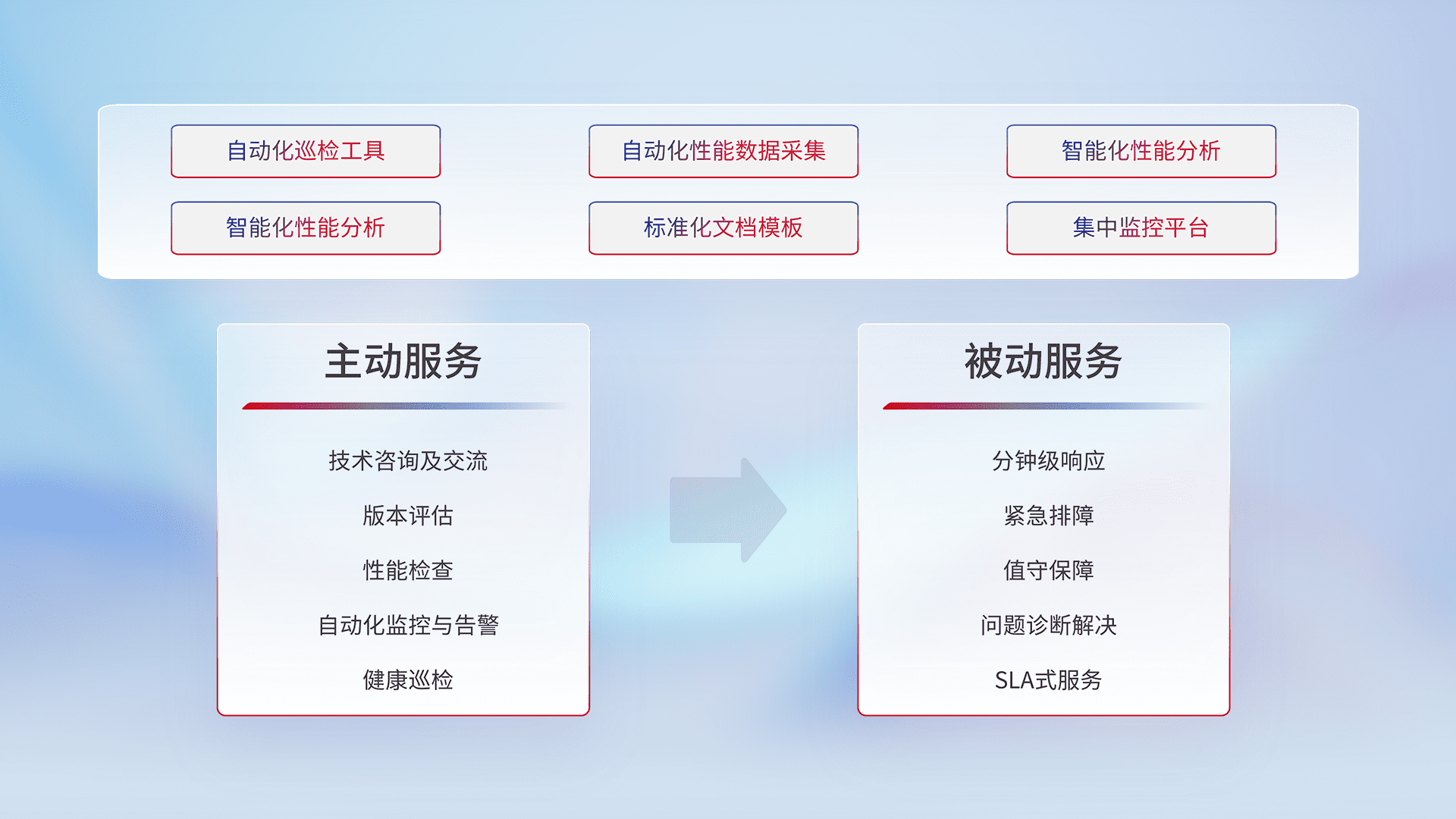 智能化工具和标准化文档,,,,保障服务质量,,,提供主动服务(包含技术咨询、、、、版本评估、、性能检查、、、自动化监控与告警、、健康巡检)和被动服务包含(分钟级响应、、、、紧急排障、、值守保障、、问题诊断解决、、、、SLA服务)。。